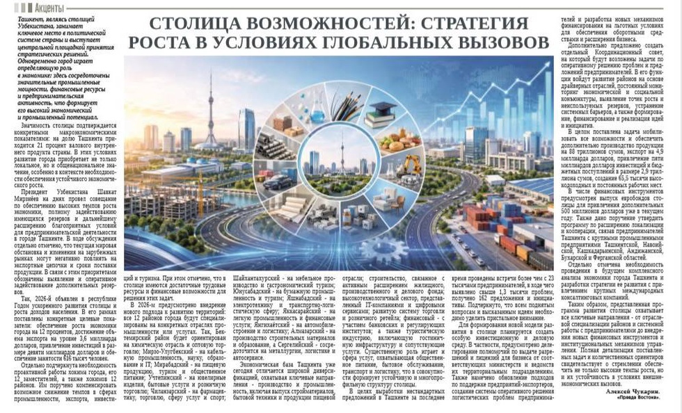 Значимость столицы подтверждается конкретными макроэкономическими показателями: на долю Ташкента приходится 21 процент валового внутреннего продукта страны. В этих условиях развитие города приобретает не только локальное, но и общенациональное значение, особенно в контексте необходимости обеспечения устойчивого экономического роста.